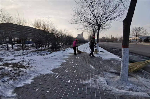裝置門前的松樹上掛滿雪球看著調(diào)皮且可愛,九點(diǎn)過后太陽開始照射,遠(yuǎn)遠(yuǎn)望去整個(gè)廠區(qū)銀光閃閃,讓人移不開眼。雖然雪景美麗但因?yàn)槁访娣e雪會(huì)導(dǎo)致員工滑倒等危險(xiǎn),且廠區(qū)其他生產(chǎn)場(chǎng)地都需繼續(xù)生產(chǎn),不能因下雪而影響,所以在欣賞完雪景后的我們也開始了積雪大清掃活動(dòng)。